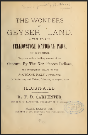 In August of 1877, George Cowan and his wife Emma decided to spend their second wedding anniversary camping in Yellowstone Park. George, 35 years old, was a moderately successful attorney in Radersberg, Montana, a small town located just about halfway between Bozeman and Helena. Seven of George and Emma's family and friends joined them on their trip to the park, including Emma's brother, Frank Carpenter, and their 14-year-old sister, Ida. The group was excited to see the geysers, waterfalls, and natural wonders they had heard about from neighbors and read about in newspapers.