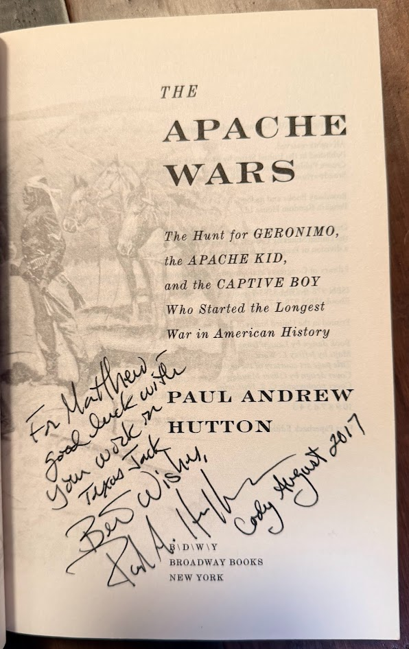 That evening’s keynote speaker was historian and author Paul Andrew Hutton, whose book The Apache Wars I had brought with me, hoping to have him sign it. After his talk, I had the chance to meet him and tell him about the project I was working on. He told me he had read the earlier book on Texas Jack and said it was great that someone was taking a fresh look at Jack and his legacy. His encouragement meant a lot to me at that moment.